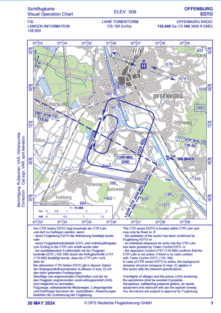 Bitte die Kontrollzone CTR Lahr bei Anflügen von Süden beachten und Freigabe für Durchflug nach EDTO in Lahr einholen, wenn Sektor Offenburg nicht aktiv ist.